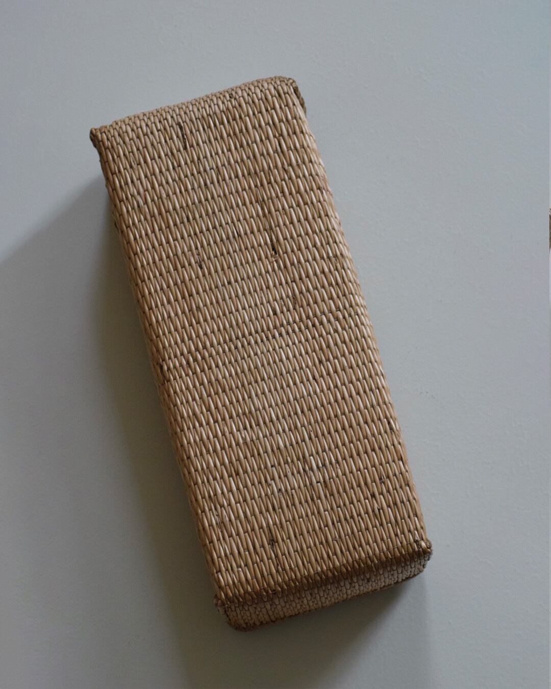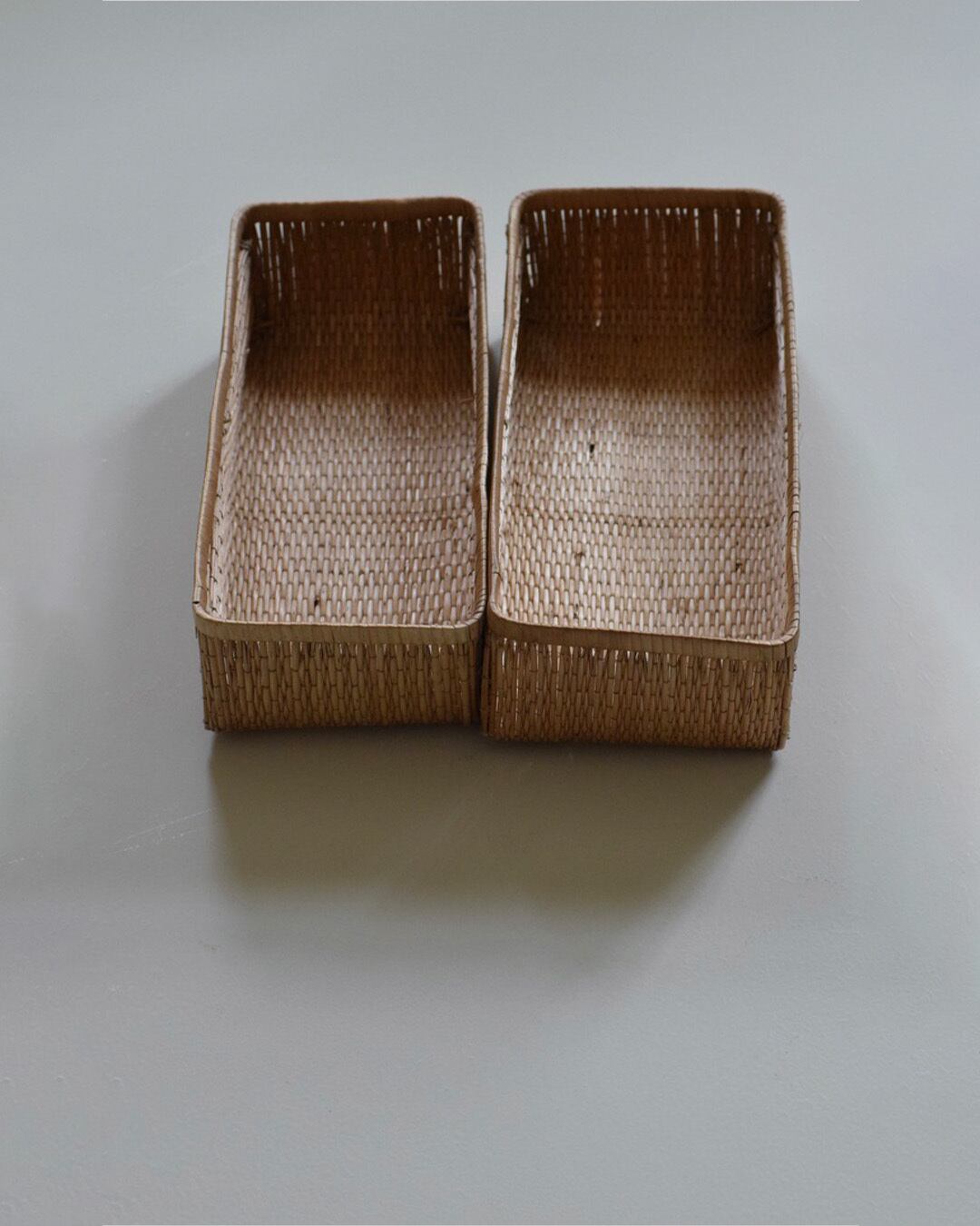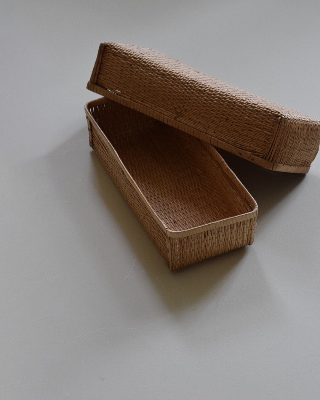 風合いのある天然素材で編まれた古いこおりです。 キッチンクロスやハンカチなど枚数の多い布小物の整理にもおすすめです。 古いもののため蓋の部分に素材の折れによる小さな穴があります。 Size 約w35㎝×d14㎝×h9.0㎝ 掲載商品の色味は出来る限り実物の色味に 近づけておりますが、ご利用のパソコン、 モニター環境によって、画像の色味が異なって 見える場合がございます。予めご了承下さいませ。