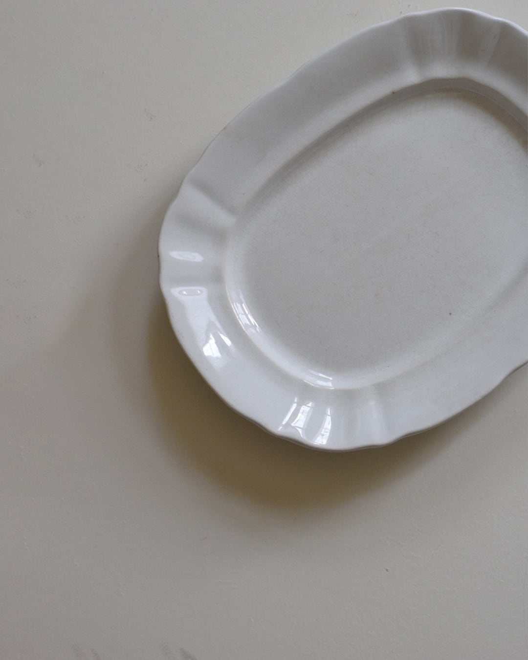 素朴で落ち着いた白色の釉薬と、繊細な貫入が美しく、アンティークならではの柔らかな佇まいが魅力の大皿。